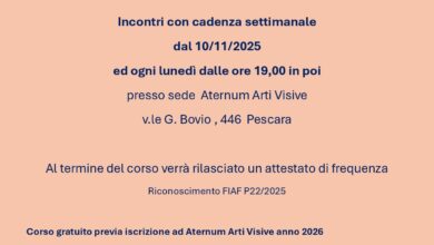 Lunedì 10 novembre e con cadenza settimanale inizia il corso di fotografia riconosciuto Fiaf P22/2025 organizzato da Aternum Arti Visive.…