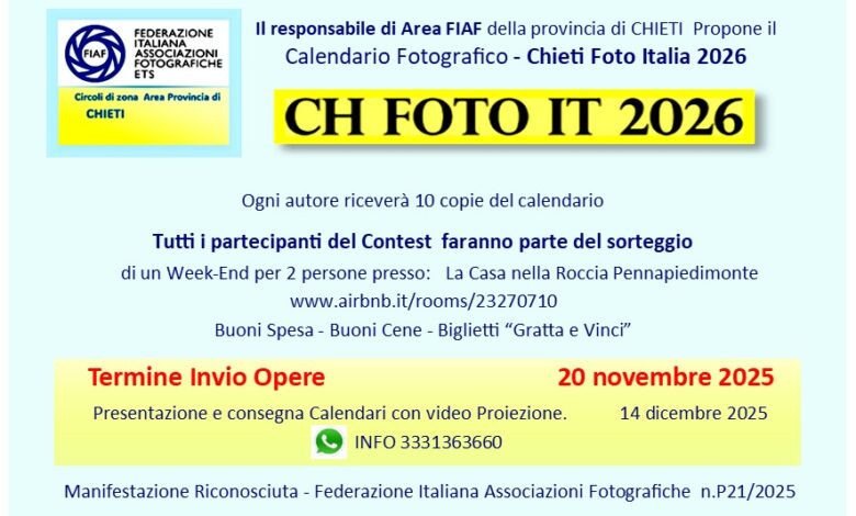 E’ aperto il contest per partecipare alla selezione delle fotografie del calendario 2026 della Provincia di Chieti con fotografie scattate sia nello stesso territorio che nel resto d’Italia. Sono abbinati dei premi e scade il 20 novembre 2025. Manifestazione organizzata dal circolo Coaper P di Pennapiedimonte. Per info 3331363660.