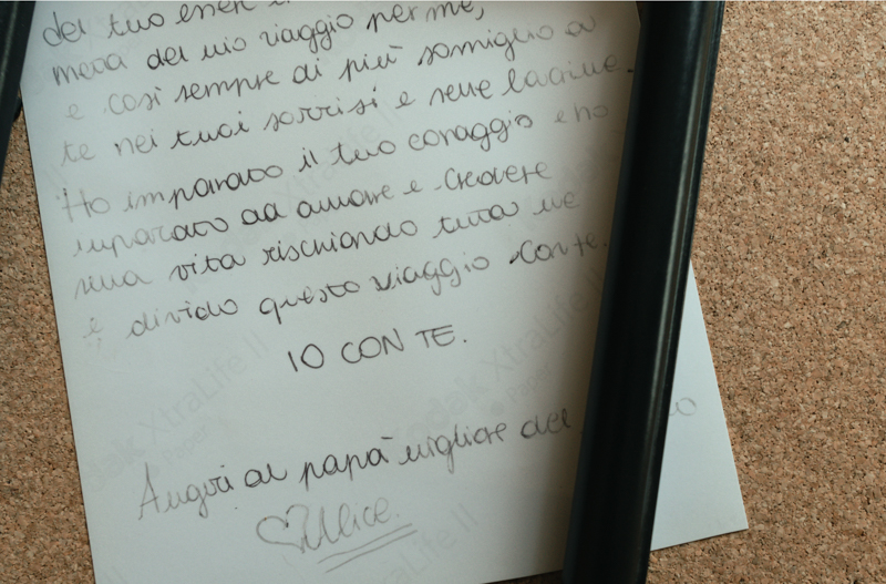 Nel lungo tempo che ci è ancora concesso, su una nostra vecchia foto insieme, mia figlia ha voluto regalarmi le sue parole e la sua calligrafia. Parla di noi, del nostro amore e del nostro viaggio, insieme.
