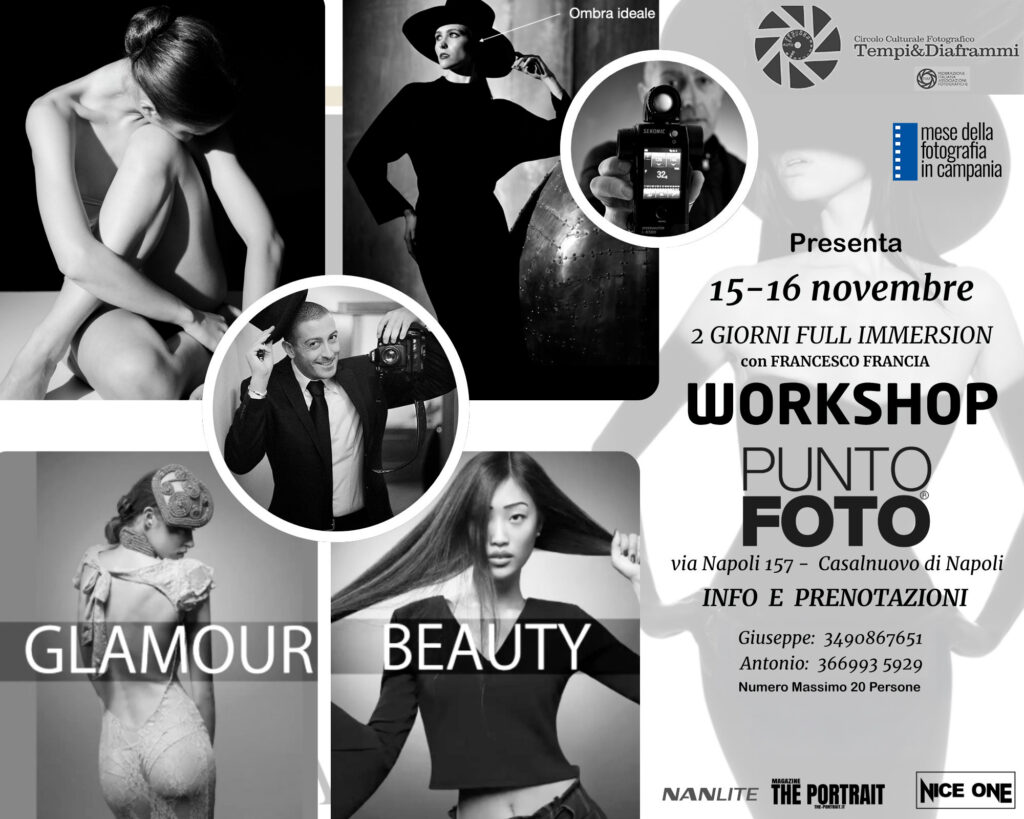 Due giorni intensivi dedicati alla fotografia glamour e beauty: tecniche di illuminazione, posa, set e gestione del cliente. Posti limitati (max 20).