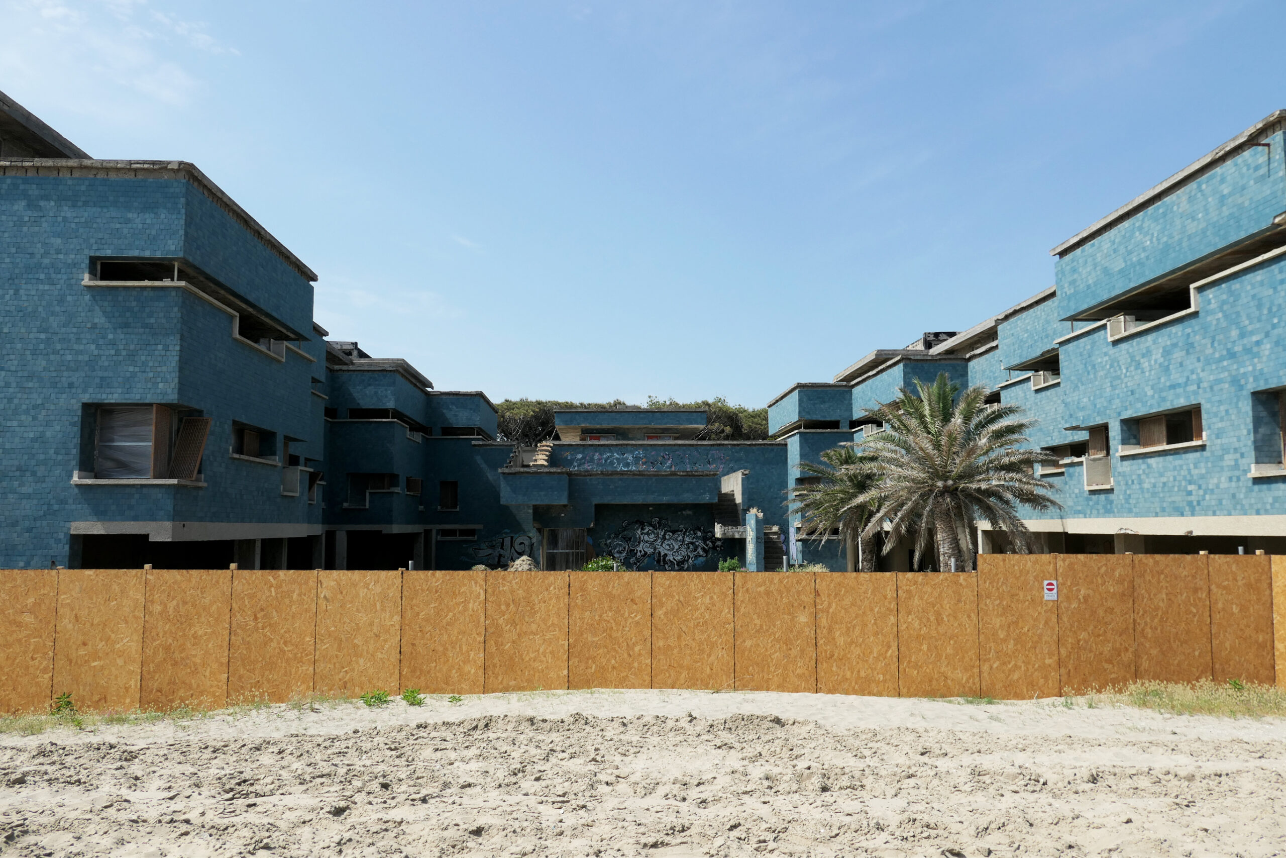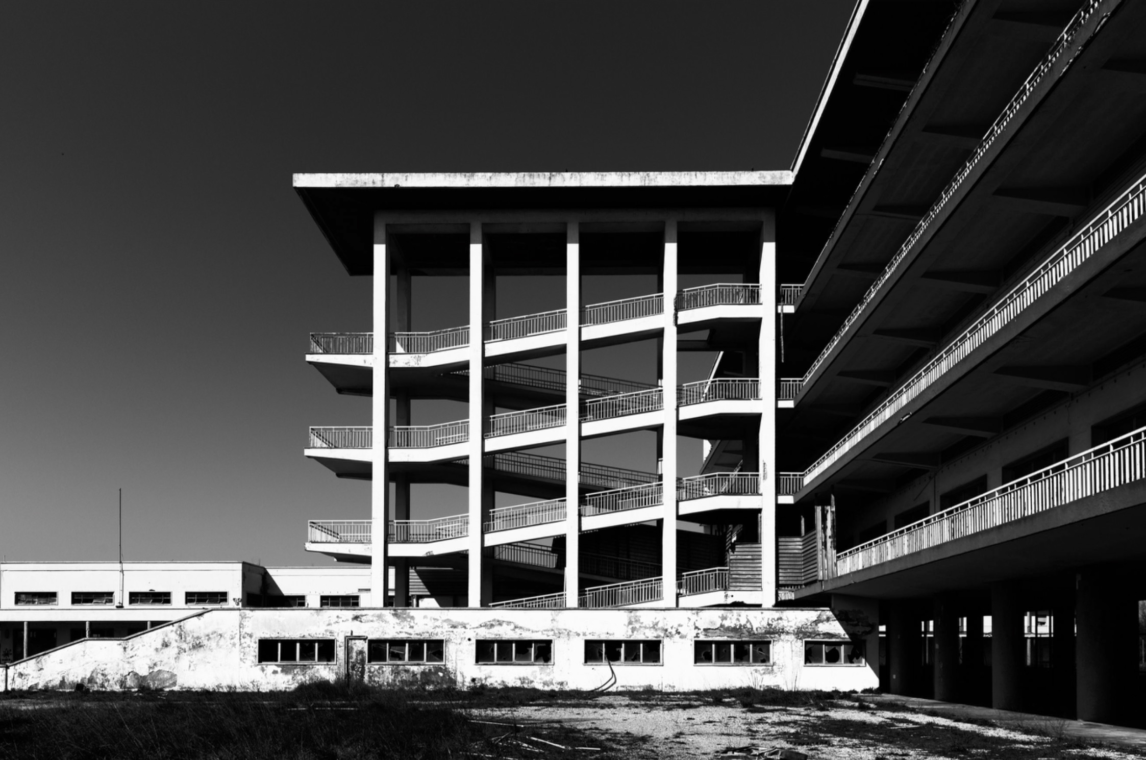 In Un’estate al mare, Fabio Gubellini fotografa colonie come architetture svuotate: inquadrature frontali, colore freddo, luce piatta e composizioni rigorose trasformano gli edifici in sculture contemplative. Il suo stile si avvicina alla fotografia tipologica, ma ne supera i limiti attraverso un uso sapiente del tempo atmosferico, delle prospettive monumentali e delle assenze umane. Le sue fotografie sembrano quasi scolpite dalla luce naturale, e restituiscono una metafisica del luogo, dove l’abbandono diventa spazio di riflessione estetica. Non nostalgia, ma osservazione asciutta e riflessiva.