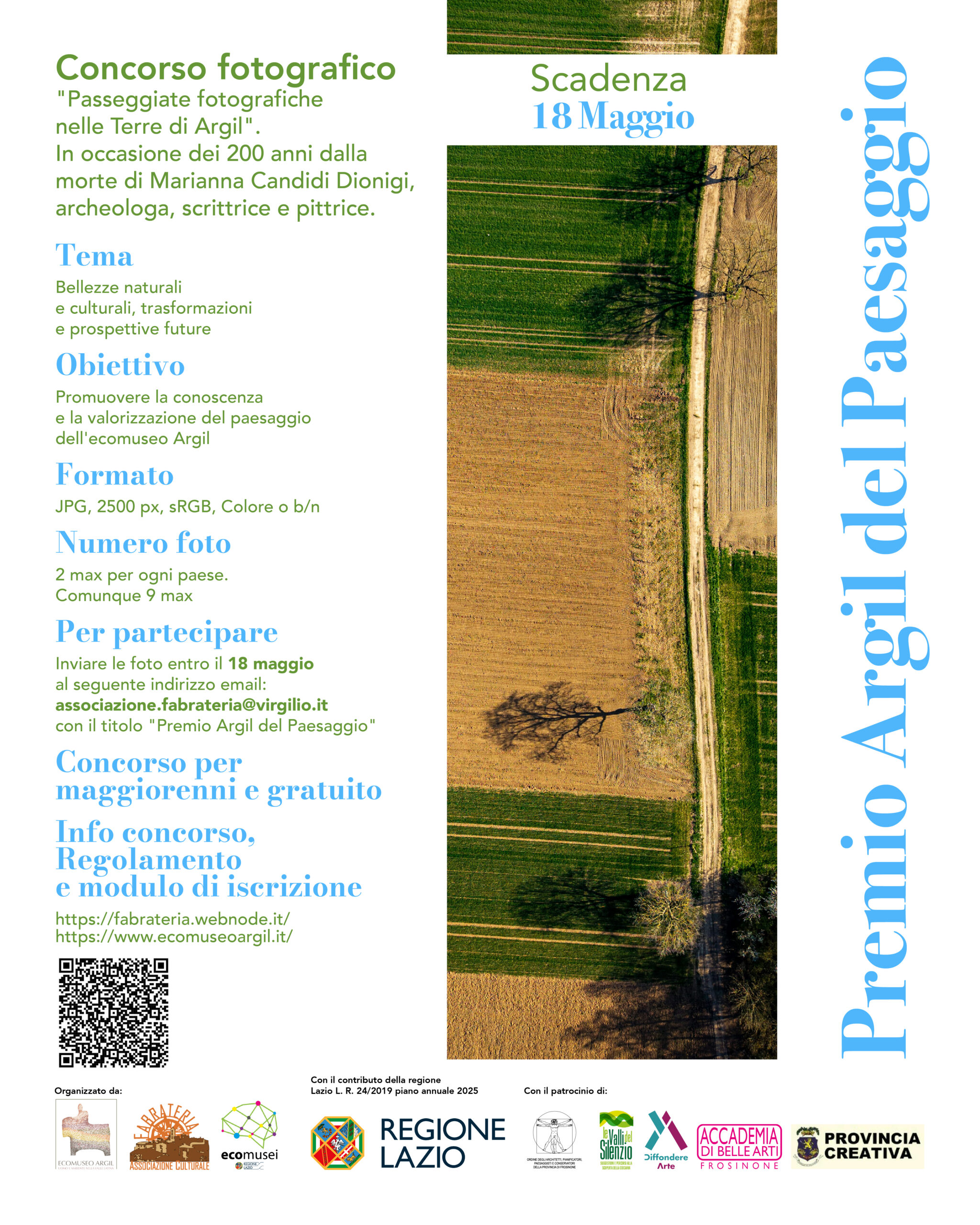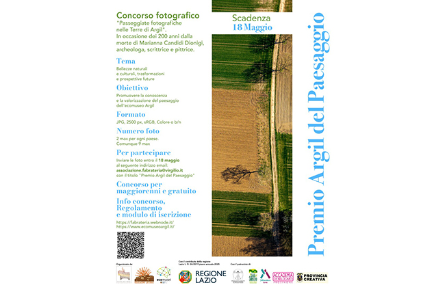 Il concorso fotografico “Passeggiate fotografiche nelle Terre di Argil – Paesaggi” è promosso dall’Ecomuseo Argil – Uomo e Ambiente nella Valle Latina in collaborazione con l’Associazione Culturale Fabrateria ODV.