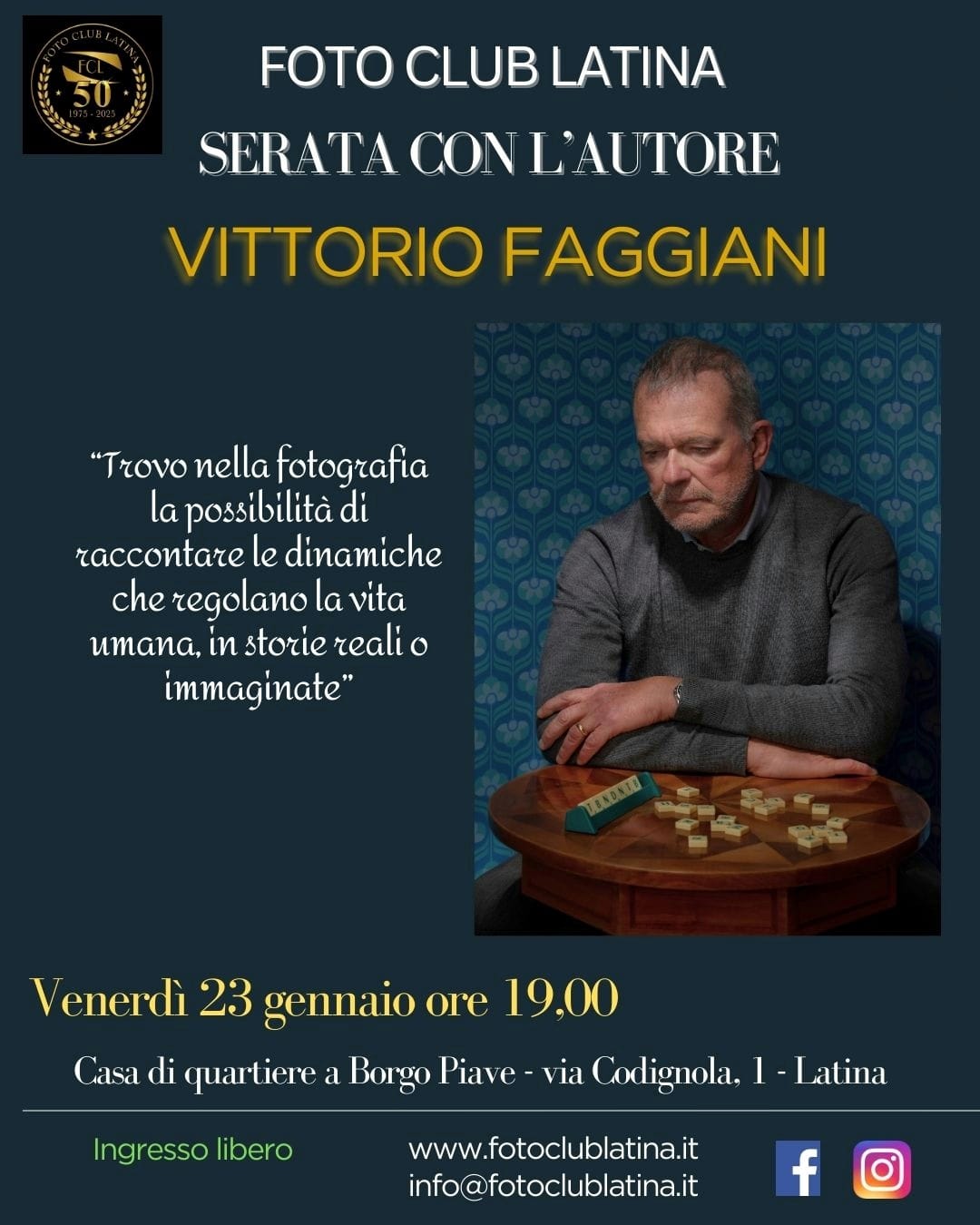 Raccontare la vita, le sue dinamiche e le sue contraddizioni attraverso la fotografia. Venerdì 23 gennaio alle ore 19.00, il Foto Club Latina ospita il fotografo Vittorio Faggiani AFI per una serata di incontro e confronto sul linguaggio fotografico, tra storie reali e immaginate.