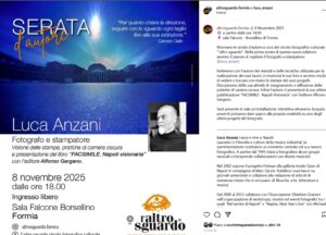 Parleremo con l’autore dei metodi e delle tecniche utilizzate per la realizzazione dei suoi lavori, ci mostrerà le sue foto e avremo modo di vedere e toccare con mano le stampe dei suoi progetti. Discuteremo della sua attività di insegnamento e diffusione delle pratiche di camera oscura. Infine l’autore ci presenterà la sua ultima pubblicazione “FACSIMILE- Napoli Visionaria” con l’editore Alfonso Gargano.
