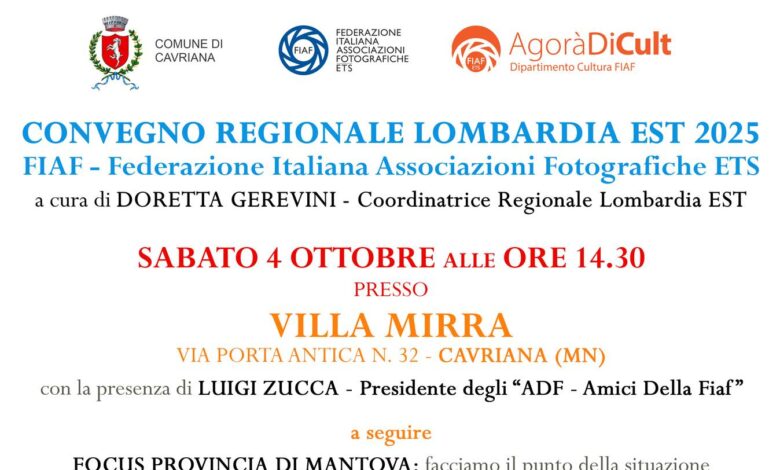 E’ con gioia che vi invito a partecipare al Convegno Regionale Fiaf Lombardia Est, che si terrà presso Villa Mirra, Via Porta Antica n. 46, a Cavriana (MN), il 4 Ottobre dalle ore 14,30 nell’ambito della Rassegna Fotografica Autori Mantovani FIAF, come da Programma dettagliato.
