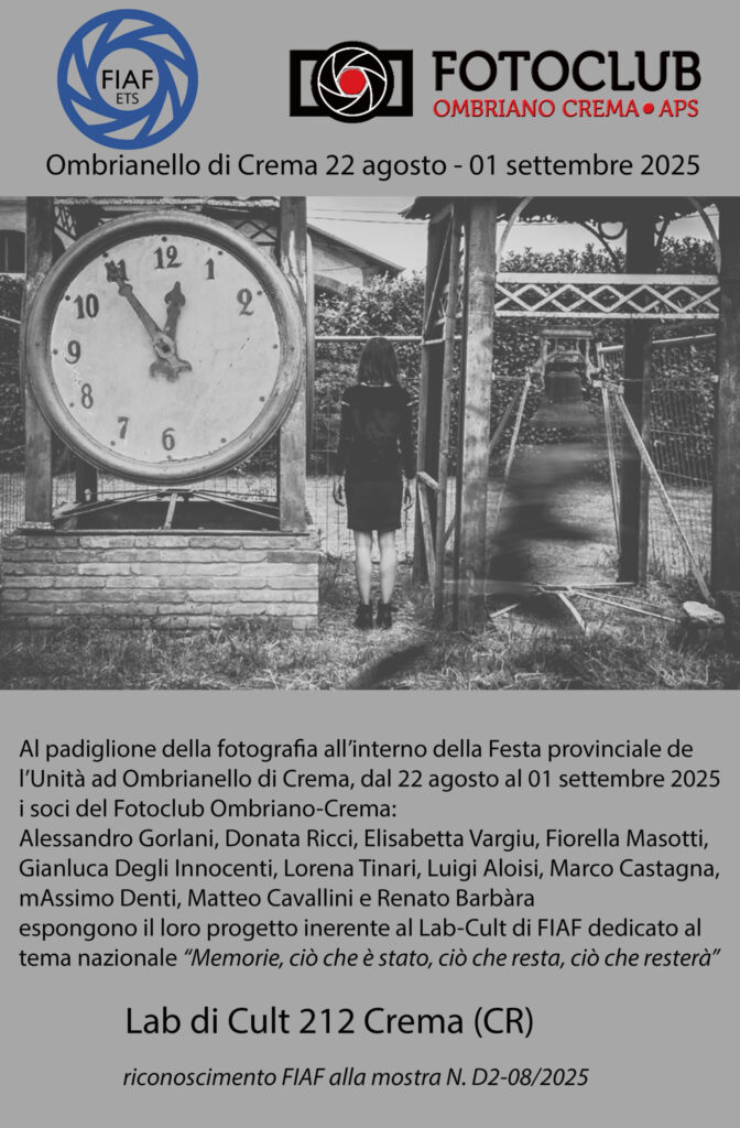 Home/Mostra Fotografica/Mostra Fotografica Collettiva – Lab Di Cult 212 Fiaf – “MEMORIE: Ciò che è stato, ciò che resta, ciò che resterà” – Dal 22 Agosto al 01 Settembre 2025 Mostra Fotografica Mostra Fotografica Collettiva – Lab Di Cult 212 Fiaf – “MEMORIE: Ciò che è stato, ciò che resta, ciò che resterà” – Dal 22 Agosto al 01 Settembre 2025 29 Agosto 2025 291 Meno di un minuto 29 Agosto 2025 291 Meno di un minuto Condividi Facebook X LinkedIn Pinterest Skype Messenger Messenger WhatsApp Telegram Condividi via Email Stampa