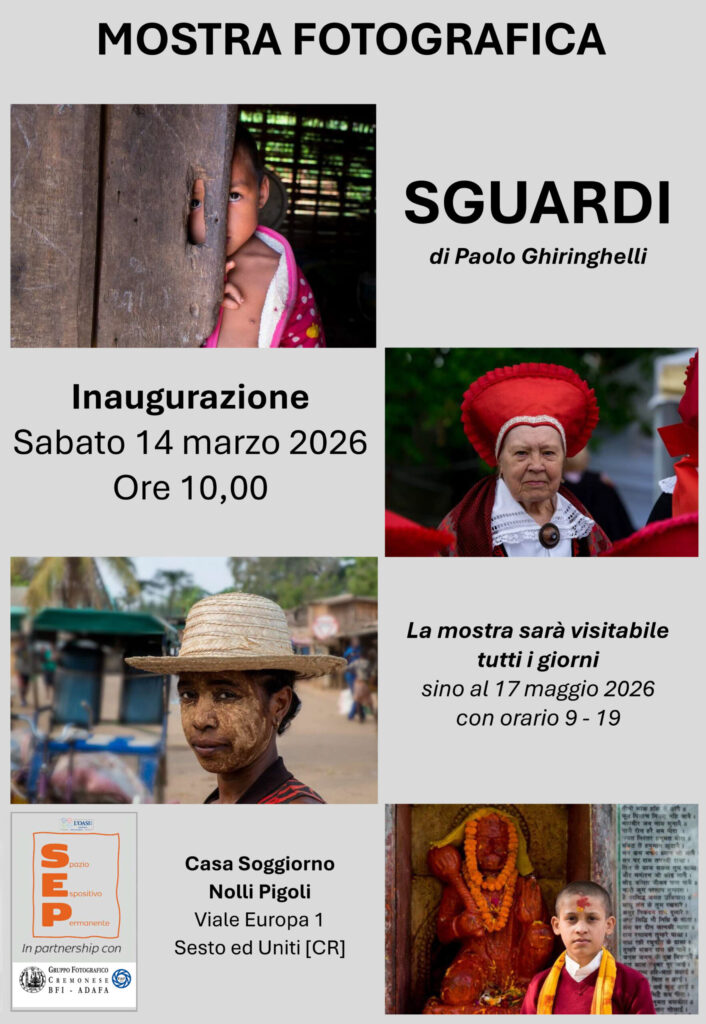 Mostra Fotografica di Paolo Ghiringhelli “SGUARDI” presso Casa Soggiorno Nolli Pigoli-Sesto ed Uniti (CR) dal 14/Marzo al 17/Maggio/2026