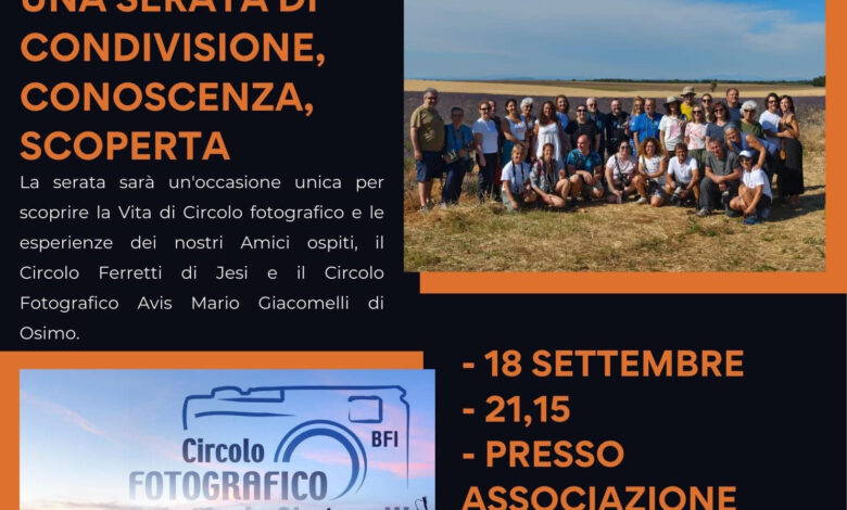 La serata sarà un’occasione unica per scoprire la Vita di Circolo fotografico e le esperienze dei nostri Amici ospiti, il Circolo Ferretti di Jesi e il Circolo Fotografico Avis Mario Giacomelli di Osimo.