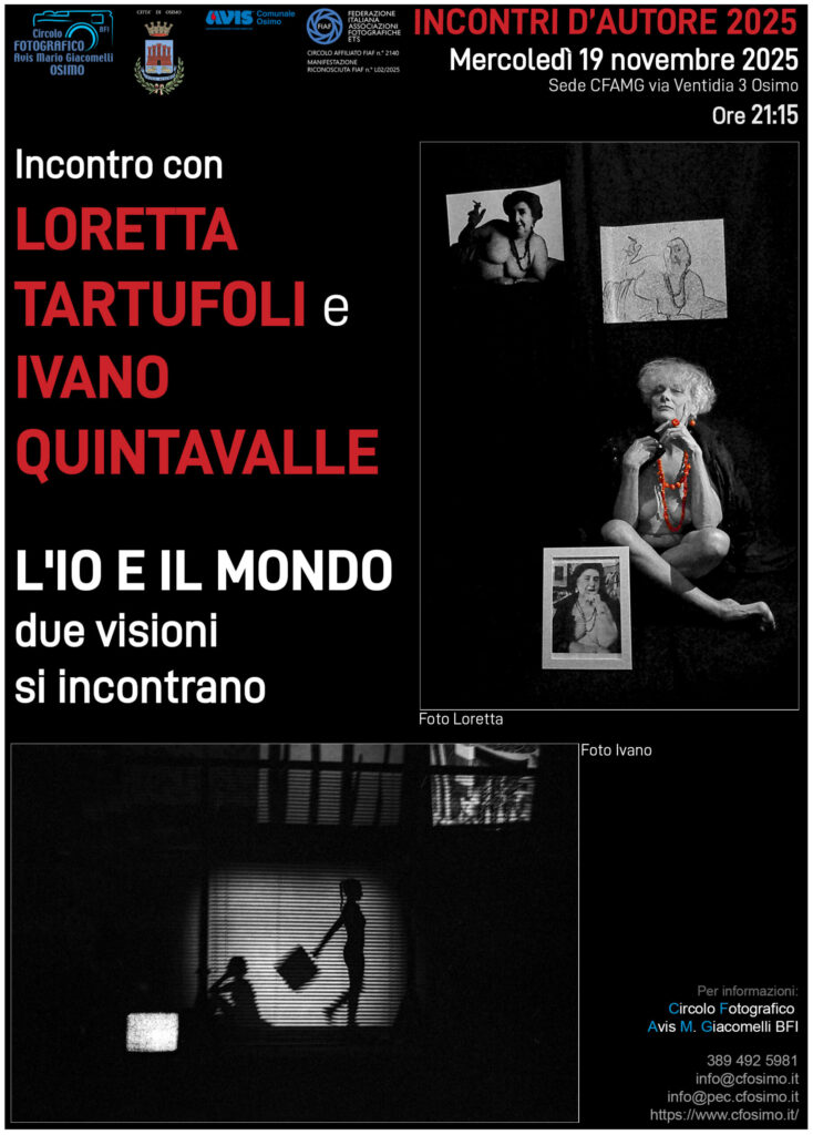 Il 19 novembre saranno ospiti del Circolo Fotografico Avis Mario Giacomelli BFI di Osimo, Loretta Tartufoli ed Ivano Quintavalle per un incontro che si prospetta molto interessante: I’Io e il mondo, due visioni si incontrano.