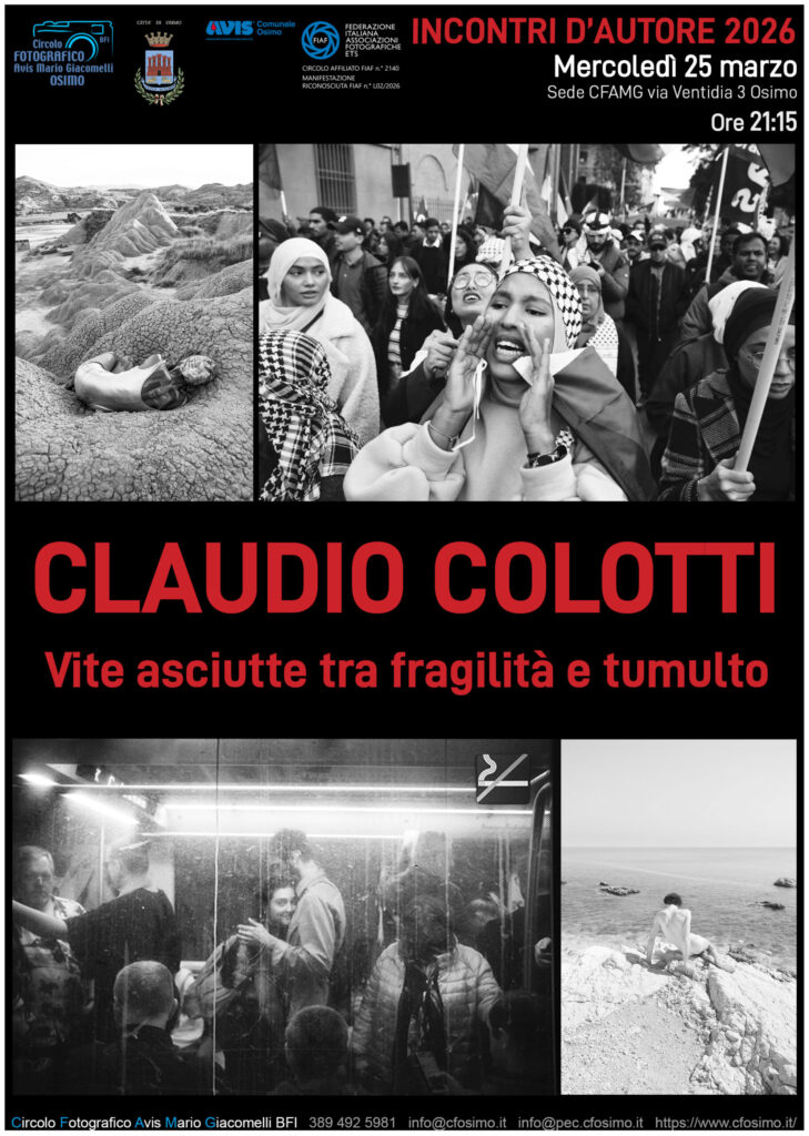 Altro importante evento al Circolo Fotografico Avis Mario Giacomelli BFI APS di Osimo, mercoledì 25 marzo, alle ore 21.15, presso la sede del Circolo, in via Ventidia 3, abbiamo il piacere di avere ospite Claudio Colotti che ci presenterà anche il suo ultimo progetto!