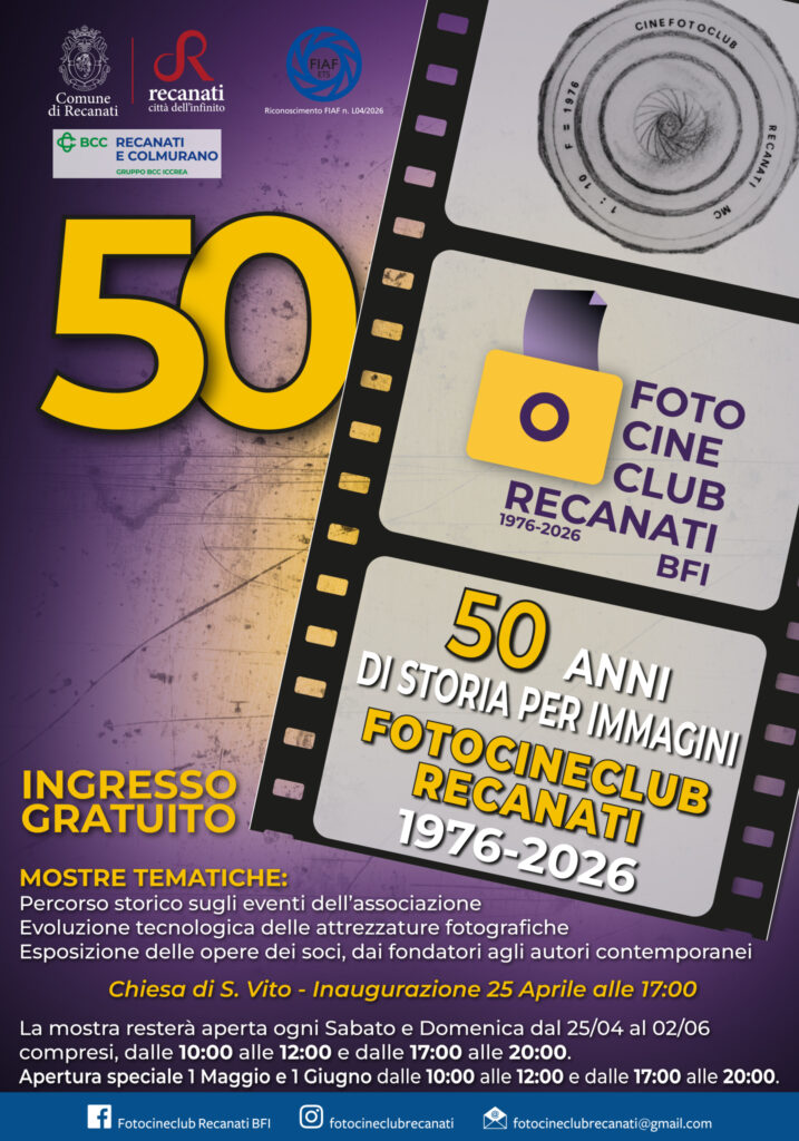 Nel 2026 il Fotocineclub BFI Recanati raggiunge un traguardo straordinario: mezzo secolo di vita associativa, dedicato a promuovere la cultura fotografica sul territorio e a raccontare e interpretare il mondo attraverso l’obiettivo.