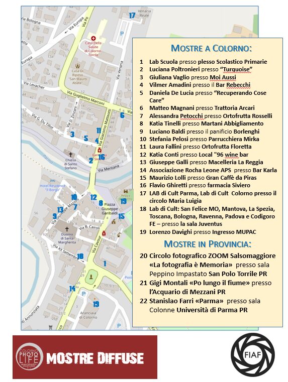 Il ColornoPhotoLife anche quest’anno si espande oltre i confini dell’Aranciaia per abbracciare l’intero territorio. Saranno interessate diverse location: dalla Venaria alla sala Juventus che ospiterà i 12 laboratori DiCult della FIAF al termine di un anno di approfondimento su tema, agli spazi commerciali di Colorno, fino a raggiungere il fiume Po, l’Università di Parma e i comuni limitrofi di San Polo di Torrile e Sorbolo, dove prenderanno vita mostre fotografiche diffuse. Questo dialogo tra arte e paesaggio celebra il ricco patrimonio culturale e naturale dell’area, trasformando il festival in un evento che vive nel cuore del territorio e rende la fotografia protagonista dell’intero comprensorio.