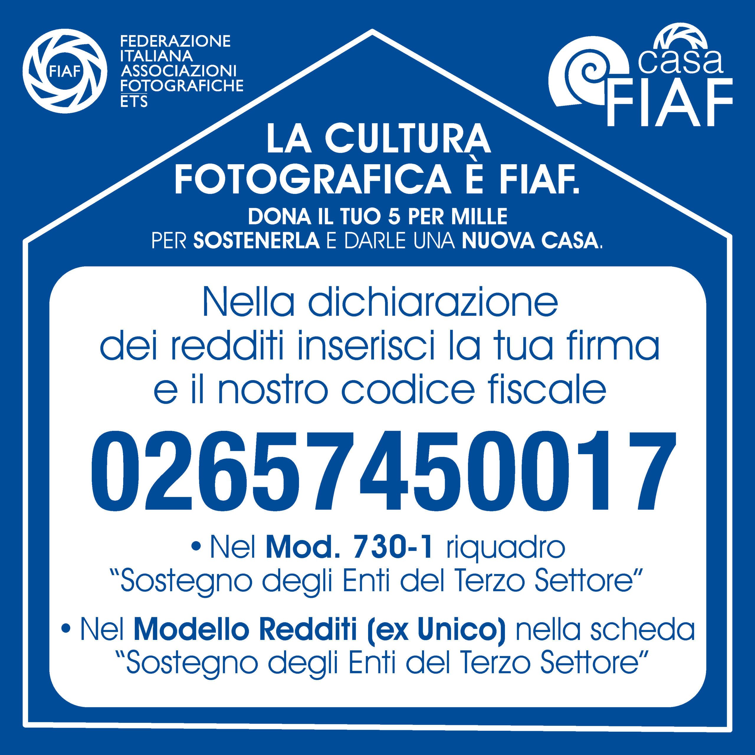 La tua scelta contribuirà alla crescita di progetti culturali come Casa FIAF a Torino – nuova sede amministrativa e galleria espositiva nazionale -, il Festival della Fotografia Italiana, il Progetto collettivo Nazionale Agrosfera. Storie di tradizioni e innovazioni e le attività formative della FIAF Academy.