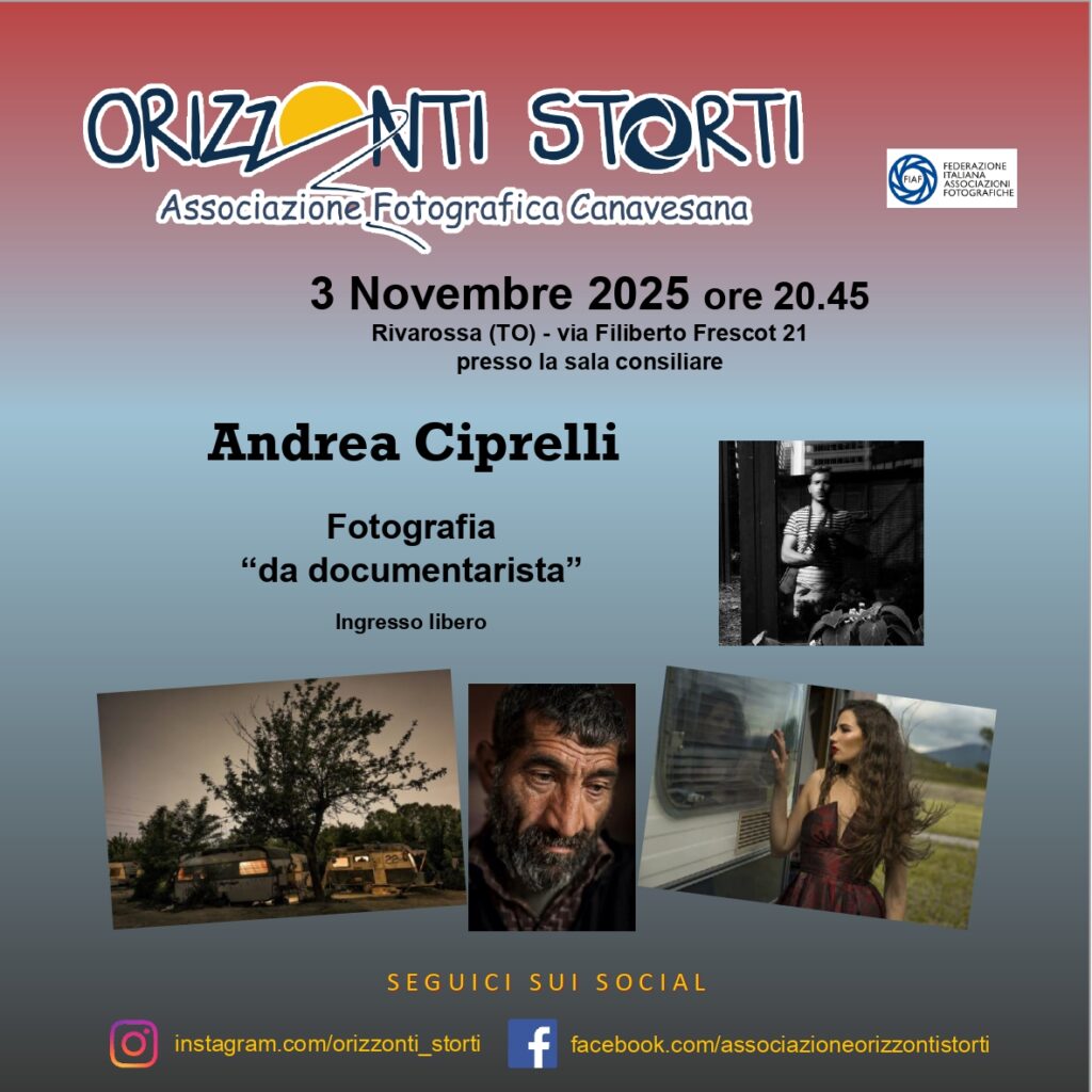 Andrea Ciprelli: “da un periodo di volontariato in una comunità Rom a “fotografo documentarista”; la presa di coscienza del potere della fotografia nel raccontare esperienze ed emozioni, con luci naturali ed ombre come punti di forza”. ORIZZONTI STORTI vi aspetta lunedì 3 dalle ore 20,45
