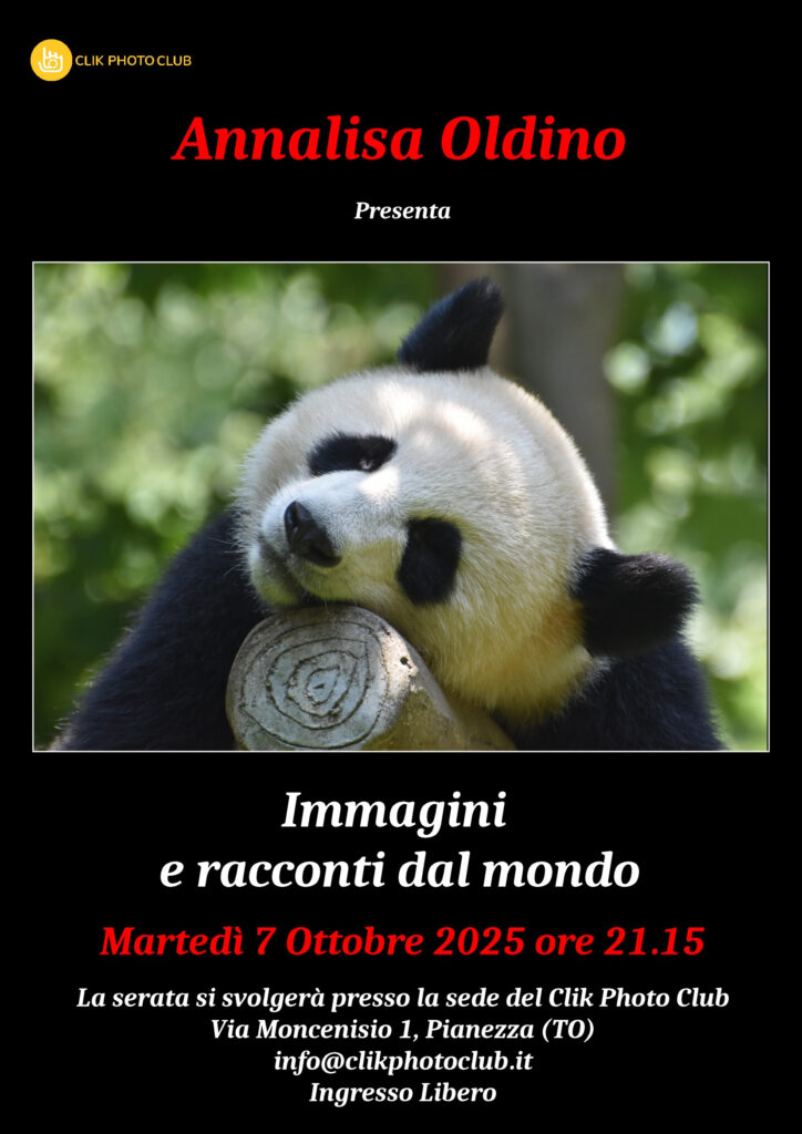 Il Clik Photo Club di Pianezza ospiterà Martedì 7 dalle ore 21,15 ANNALISA OLDINO con il suo viaggio tra i Panda e i suoi racconti in giro per il mondo