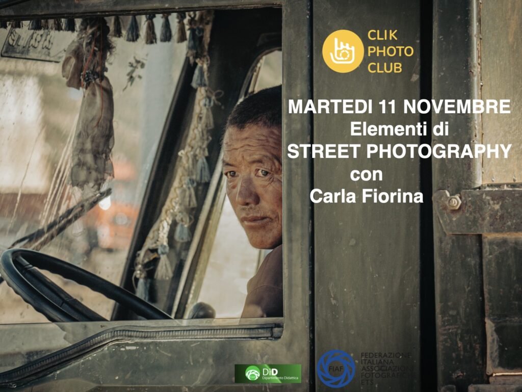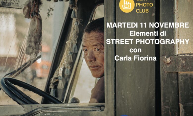 Martedì 11 novembre Carla Fiorina terrà una serata tecnica sugli “Elementi della Street photography” presso il Clik Photo Club di Pianezza
