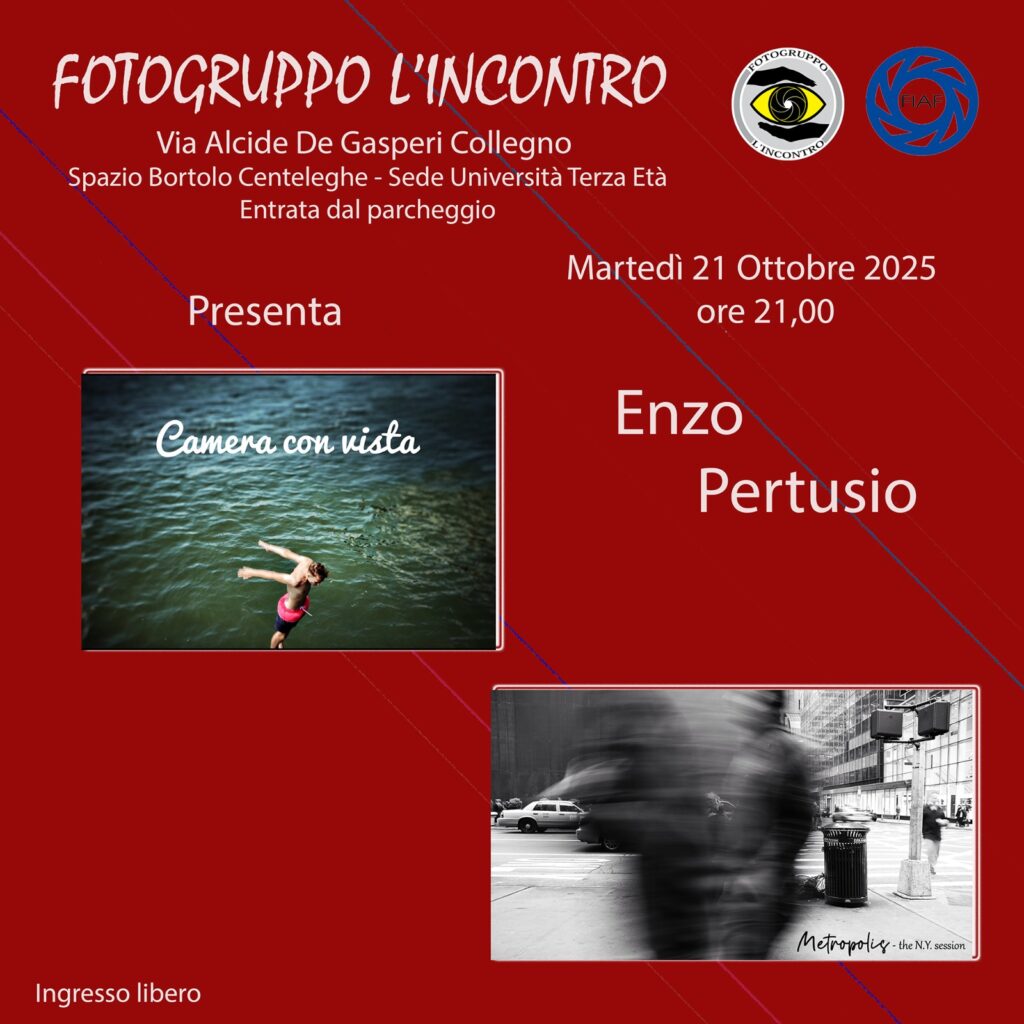 Il Fotogruppo L’Incontro di Collegno, martedì 21 dalle ore 21,00, ospiterà ENZO PERTUSIO con i suoi racconti fotografici “CAMERA CON VISTA” e “METROPOLIS”
