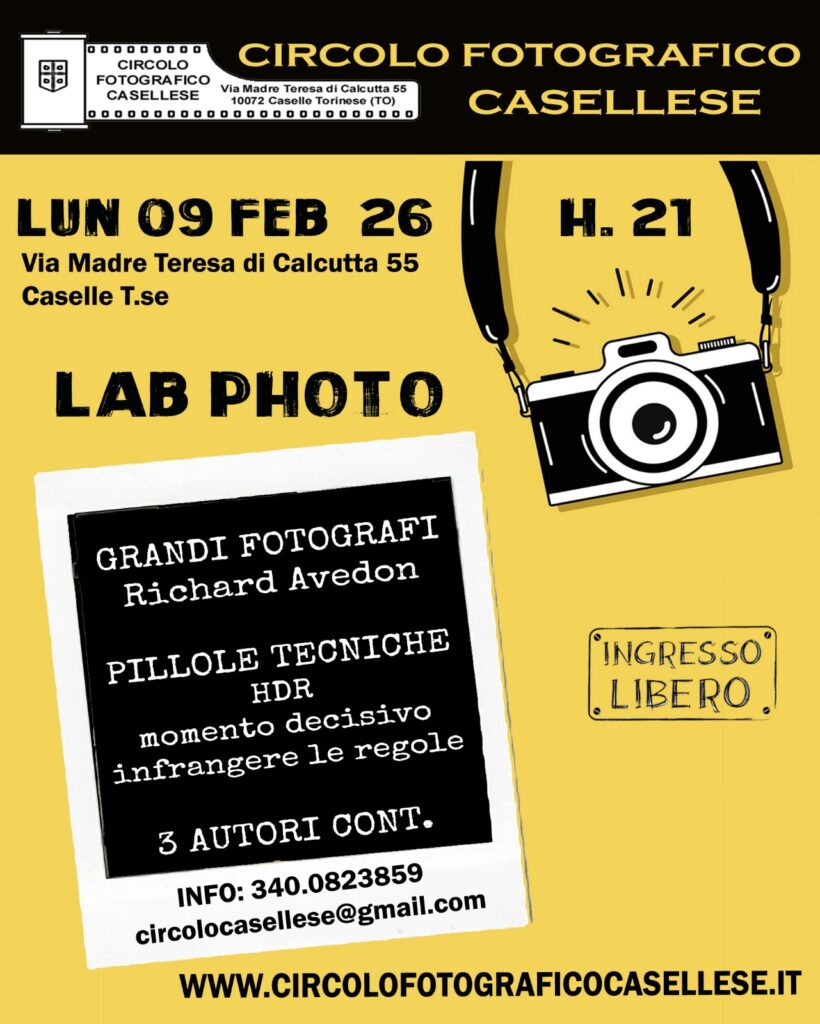 Il Circolo Fotografico Casellese presenterà LUNEDI’ 09 una serata tecnica in cui si parlerà di autori contemporanei e non, e tante altre cose
