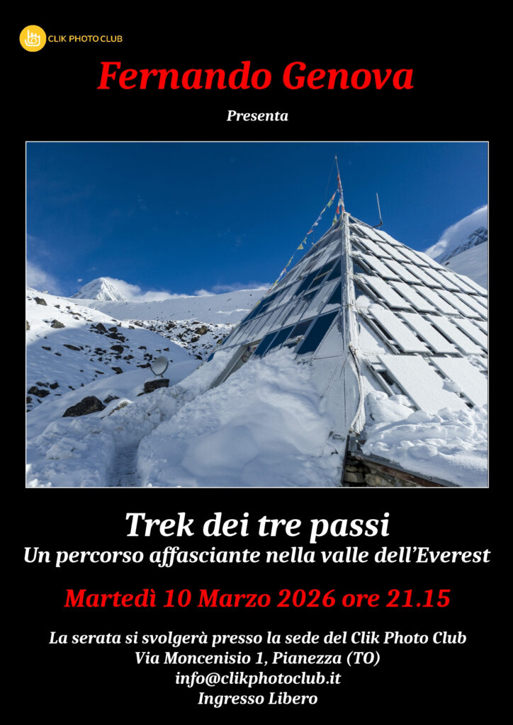 Se avete voglia di “faticare stando comodamente seduti” vi aspettiamo martedì 11 dalle ore 21,15 presso il Clik Photo Club di Pianezza con FERNANDO GENOVA e le sue immagini sul “TREK DEI TRE PASSI – Un percorso affascinante nella valle dell’Everest”.