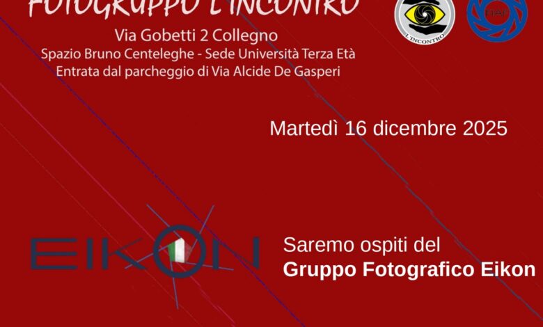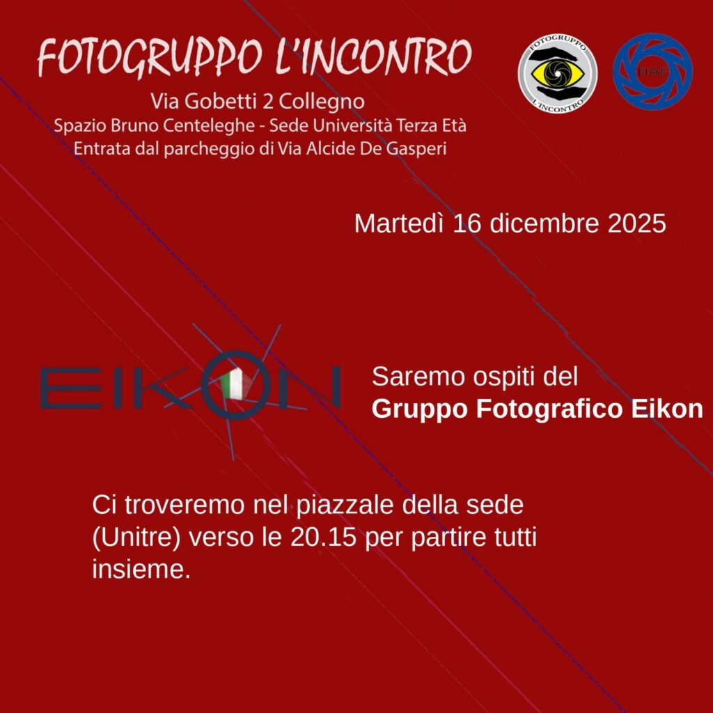Il soci del Fotogruppo L’INCONTRO di Collegno saranno ospiti del Gruppo Fotografico EIKON di Torino martedì 16 dalle ore 21,00 per parlare di fotografia presentando le proprie opere.