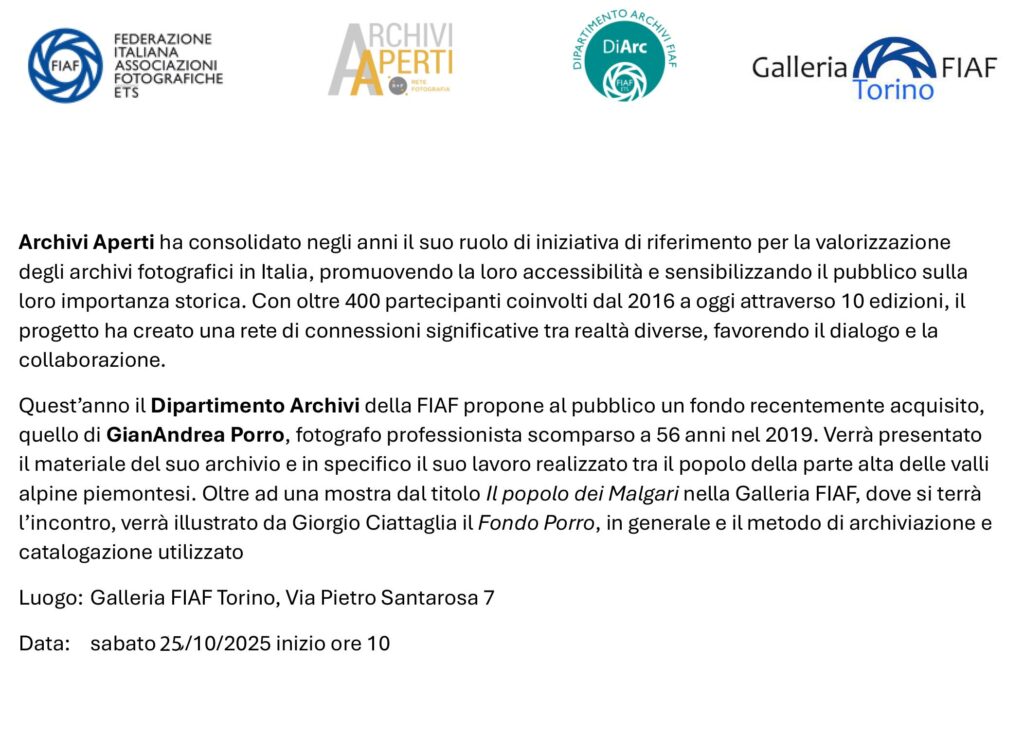 Incontro in GALLERIA FIAF a Torino con una giornata dedicata agli “ARCHIVI APERTI” – Sabato 25 dalle ore 10,00