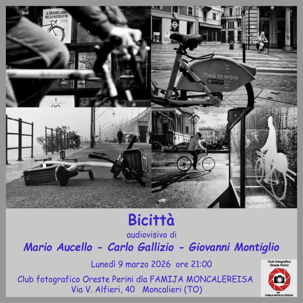 Mario Aucello, Carlo Gallizio e Giovanni Montiglio presenteranno il loro audiovisivo “BICITTA'” presso il Club Fotografico ORESTE PERINI DLA FAMIJA MONCALEREISA Lunedì 9 dalle ore 21,00 – NON MANCATE e scoprirete di poter fare un ottimo lavoro semplicemente guardandovi intorno, tra le vie cittadine che frettolosamente percorrete tutti i giorni!