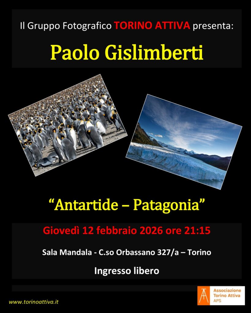 PAOLO GISLIMBERTI ci racconterà il suo viaggio in ANTARTIDE e PATAGONIA attraverso immagini spettacolari. Vi aspettiamo presso il Gruppo Fotografico TORINO ATTIVA – GIOVEDI’ 12 dalle ore 21,15