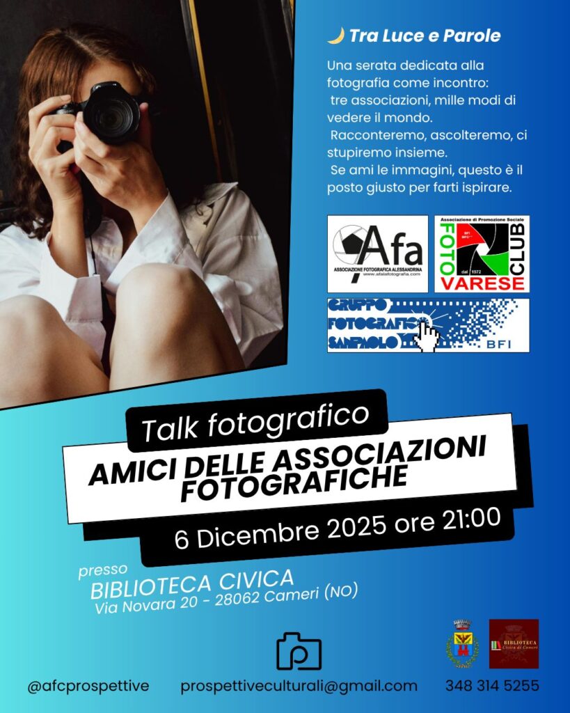 Talk fotografico “Tra Luce e Parole”: sarà una serata dedicata alla fotografia, al confronto e all’ispirazione. I circoli hanno bisogno di conoscersi, di confrontarsi, di condividere la propria passione e quindi perché non incontrarsi e fare quattro chiacchiere tra amici? Vi aspettiamo SABATO 6 DICEMBRE DALLE ORE 21,00 presso la Biblioteca di CAMERI (NO)