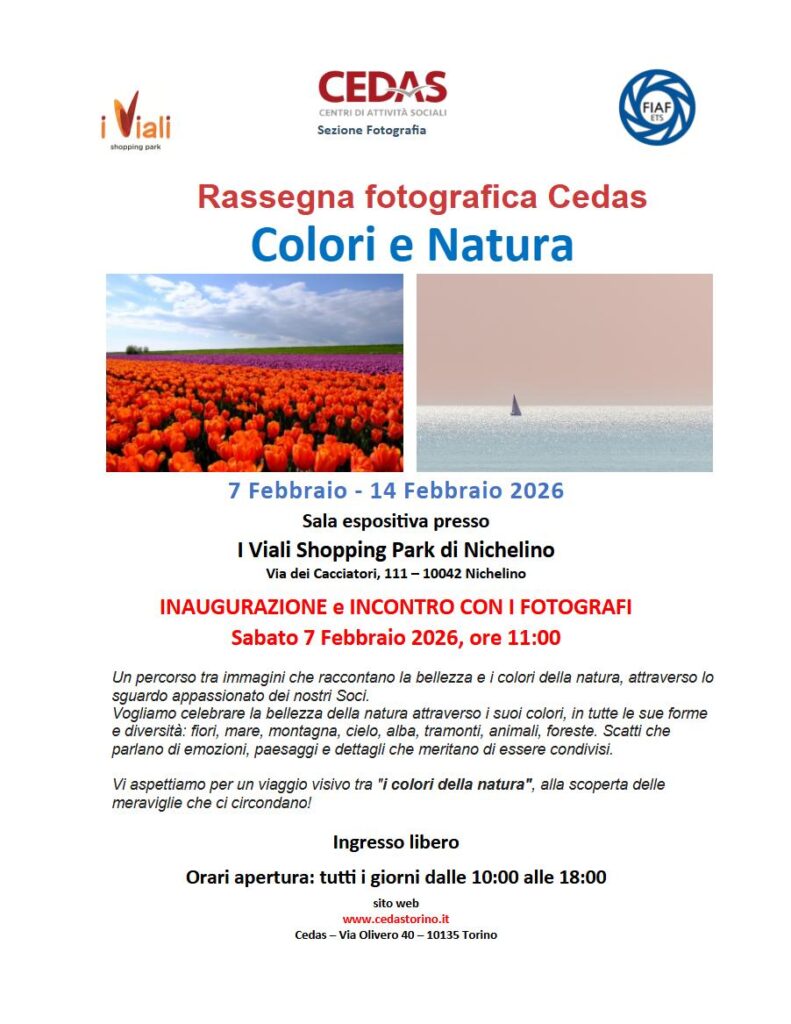 SABATO 7 FEBBRAIO alla ore 11,00 inaugurazione della mostra fotografica del CEDAS presso I VIALI SHOPPING PARK di Nichelino