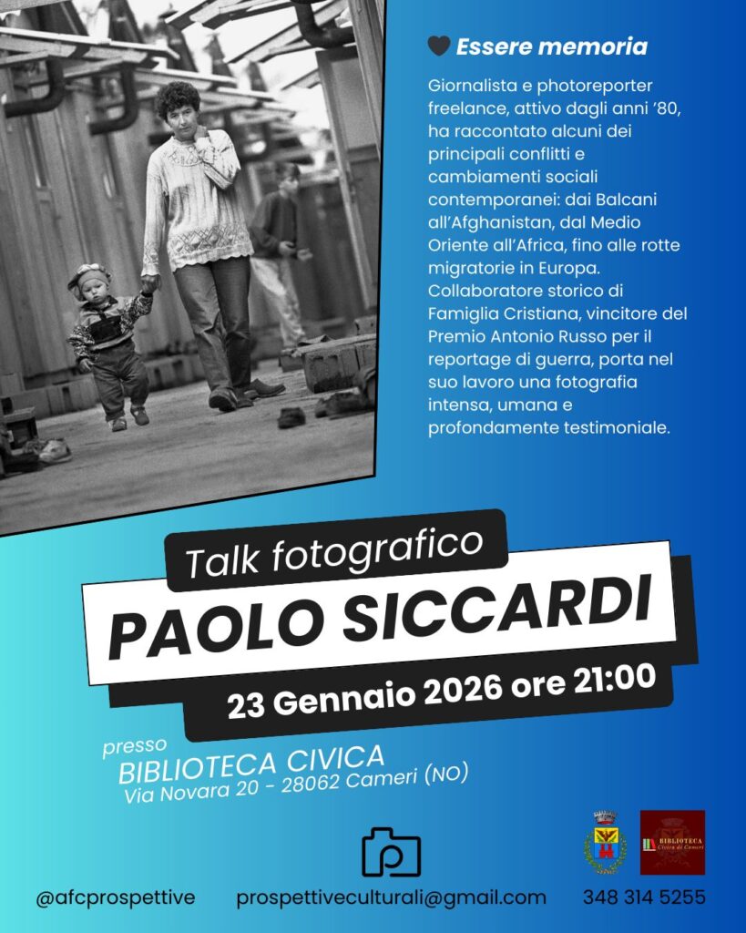 Talk fotografico con PAOLO SICCARDI venerdì 23 gennaio alle ore 21:00, presso la Biblioteca comunale di Cameri (Via Novara 20) – DAI TEATRI DI GUERRA ALLE ROTTE DEI MIGRANTI