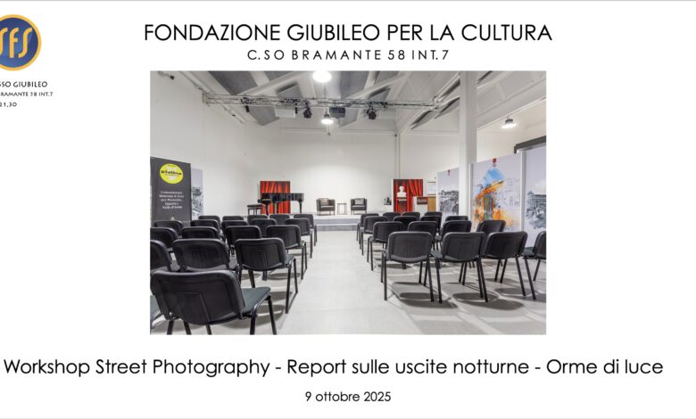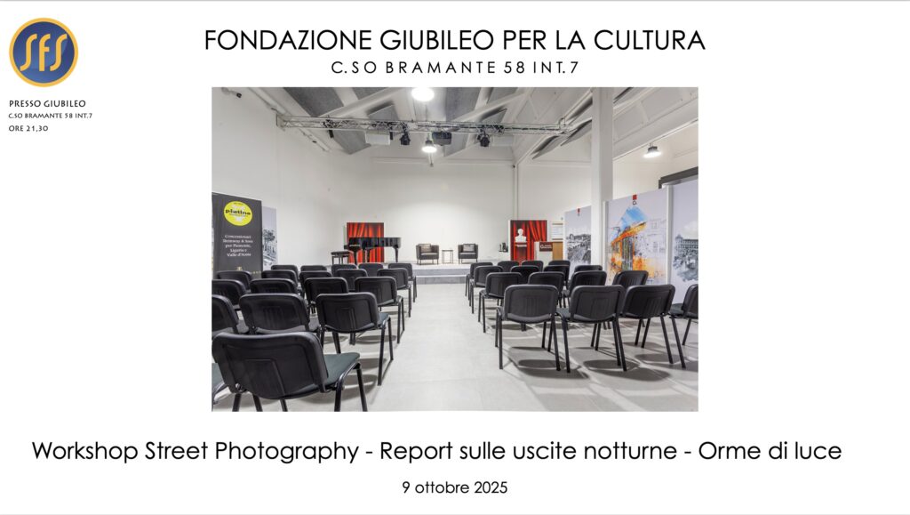 Giovedì 9 ottobre dalle ore 21,30 la Società Fotografica Subalpina terrà un Workshop di street photography presso la Fondazione Giubileo per la Cultura commentando le immagini delle loro varie uscite notturne.