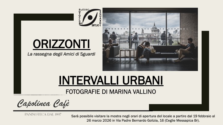 Prosegue la bellissima collaborazione tra il Fotoclub Sguardi Oltre BFI di Monopoli (Ba) ed il Capolinea Cafè di Ceglie Messapica nel segno di “ORIZZONTI”, la rassegna fotografica degli Amici di Sguardi”, un progetto a firma del circolo FIAF monopolitano, un modo per far rete e far conoscere nuovi autori e nuovi “sguardi” sul territorio.