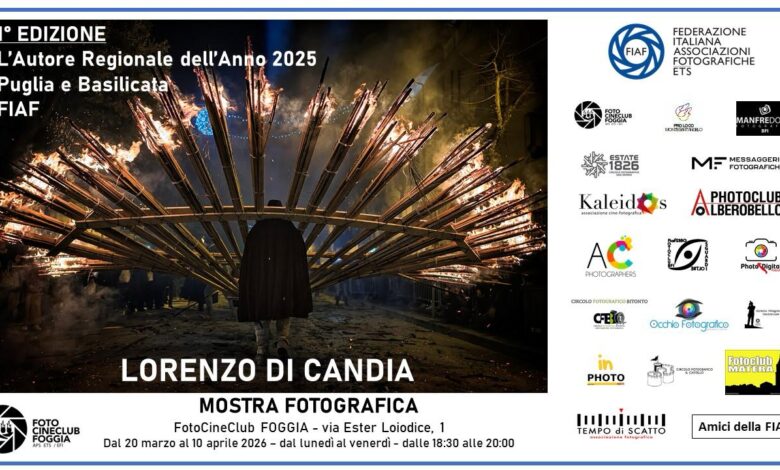 Il FotoCineClub Foggia ospita le foto di Lorenzo Di Candia, nominato Autore Regionale FIAF per la Puglia e la Basilicata nella Prima Edizione della manifestazione, conclusasi a fine 2025 e proseguita con le mostre ospitate dai circoli regionali.