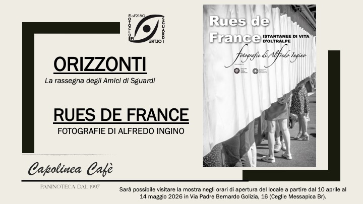 Prosegue la bellissima collaborazione tra il Fotoclub Sguardi Oltre BFI di Monopoli (Ba) ed il Capolinea Cafè di Ceglie Messapica nel segno di “ORIZZONTI”, la rassegna fotografica degli Amici di Sguardi”, un progetto a firma del circolo FIAF monopolitano, un modo per far rete e far conoscere gli autori della nostra regione ed il loro “sguardo” sul mondo.
