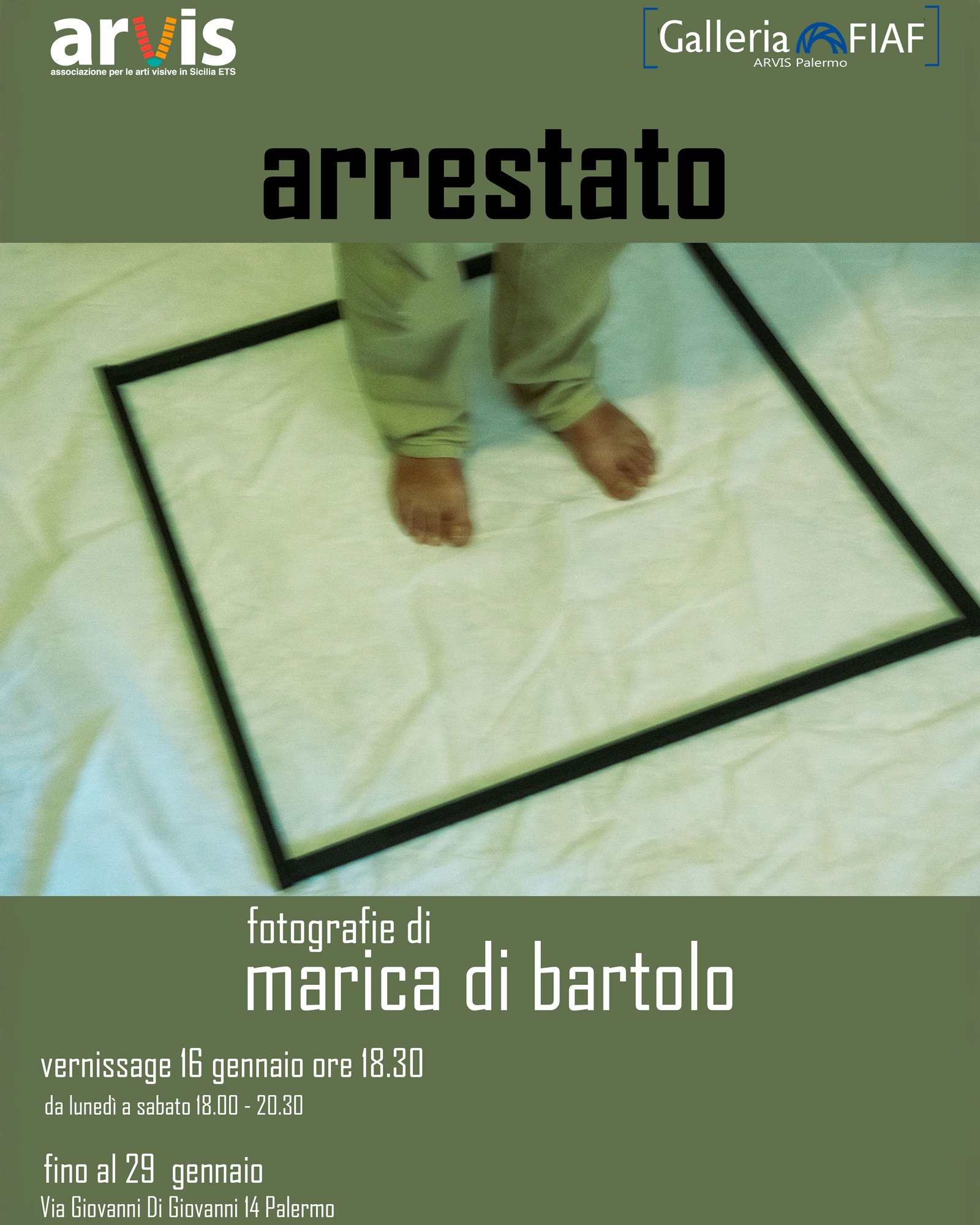 Venerdi 16 Gennaio dalle ore 18.30 avremo il piacere di inaugurare la mostra “Arrestato” di Marica Di Bartolo presso la sede di Via Giovanni Di Giovanni, 14 Palermo.