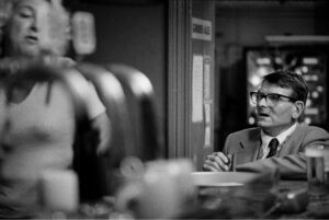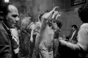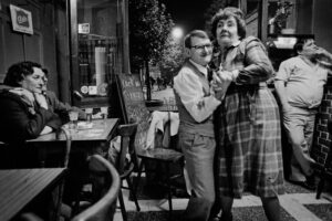 Mi hanno colpito molto in “Brussels Cafe” i volti di uomini e donne che frequentavano e animavano Il caffè 3 Porte”s di Bruxelles, un ritrovo per la gente del posto, che non esiste più. Un luogo importante di socializzazione, dove bere, ballare, e perchè no anche trovare l’anima gemella. Nasce da scatti realizzati, vicino casa, a km zero. da rullini scordati e per fortuna recuperati. Schroeder ci restituisce veri momenti di intimità e di libertà, quelli sì ormai andati perduti. Atmosfere di altri tempi. Ma anche no. La voglia di condividere e di vicinanza, di fare tribù tipica dell’uomo.