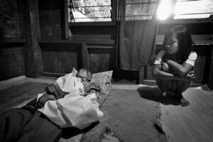 In the family home, 10 year old Kanan, watches over her grandfather, Ne’ Dennupa who passed away a week ago (July 10, 2016). It will take a year or two to gather the family from distant islands, save money and determine the number and purchase enough buffalo for the funeral. Until then, Ne Dennupa’ will remain here in the family’s home just as he is now, lying comfortably on a thin mattress with a pillow over a tightly woven bamboo mat. Two coins have been placed on his cheek and his forehead symbolizing pocket change for the journey to paradise (puya).