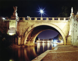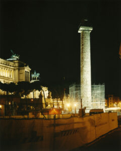 La composizione è rigorosa. Le inquadrature sono spesso frontali o basate su linee ben riconoscibili. Le geometrie dell’architettura guidano lo sguardo: muri, finestre, strade e colonne diventano elementi che ordinano lo spazio. I vuoti sono importanti quanto i pieni. Anche quando l’immagine mostra un luogo complesso, tutto appare misurato e leggibile. Questo modo di costruire la fotografia rende le immagini calme e stabili, invitando a osservarle con lentezza.