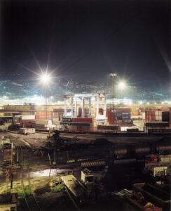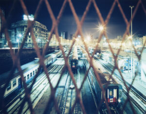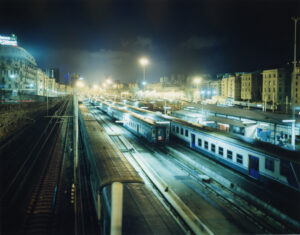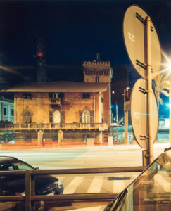 Dal punto di vista tecnico, molte fotografie sono realizzate con luce artificiale, spesso notturna. I lampioni, le luci interne degli edifici o i riflessi sull’asfalto bagnato creano forti contrasti tra zone illuminate e zone in ombra. Questo tipo di luce rende gli spazi più vuoti, più sospesi, quasi fuori dal tempo. Il colore è presente ma mai acceso: prevalgono toni freddi, blu e verdi, alternati a gialli e aranci delle luci urbane. Il colore serve a costruire un’atmosfera, non a decorare l’immagine.