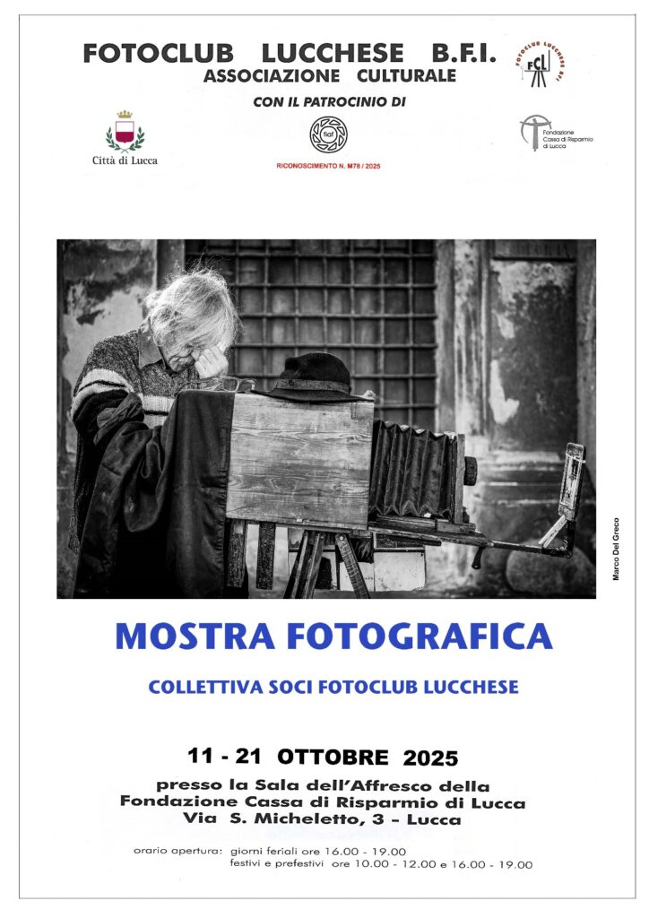 Sabato 11 ottobre 2025, presso la Sala dell’Affresco della Fondazione Cassa di Risparmio di Lucca (via San Micheletto 3), si terrà l’inaugurazione della mostra fotografica collettiva del Fotoclub Lucchese.