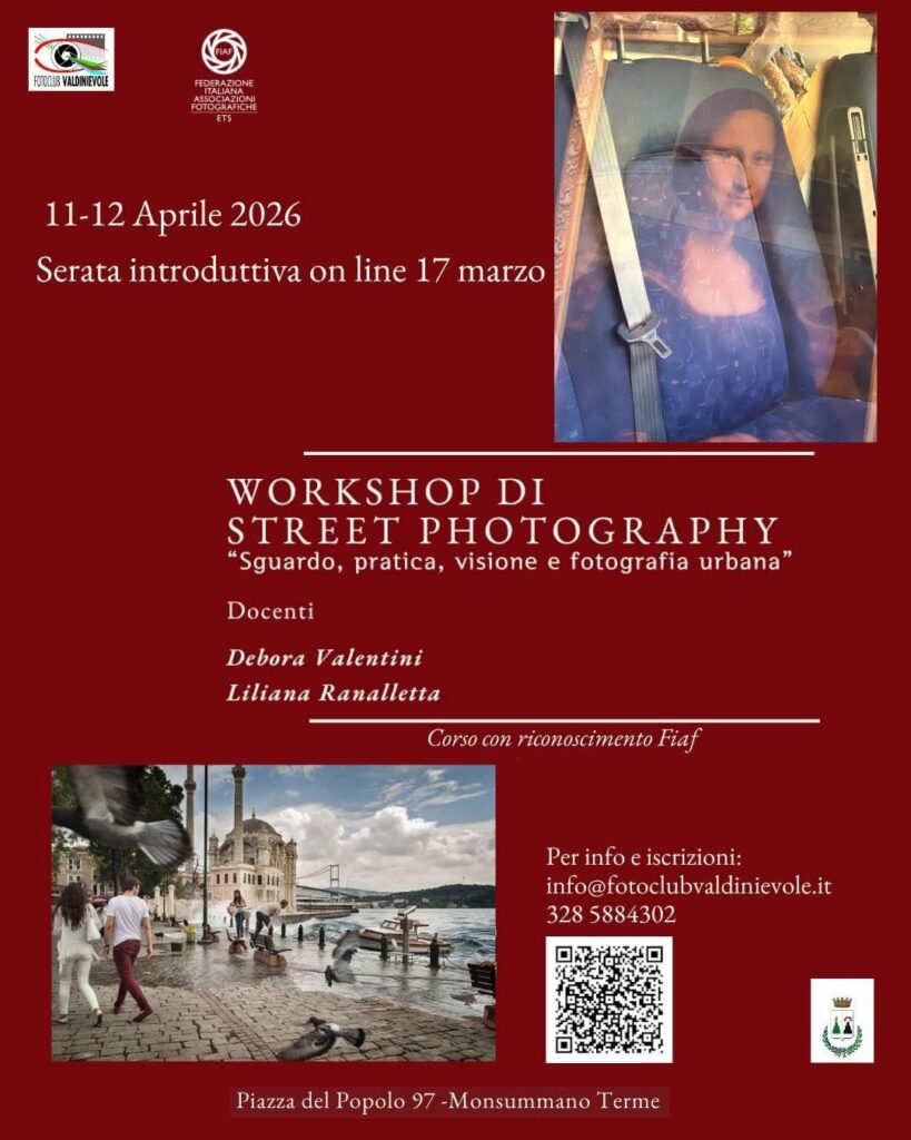 Il Fotoclub Valdinievole organizza un workshop con riconoscimento Fiaf M18-2026, di street photography nei giorni 11 e 12 aprile 2026, a cura di Debora Valentini e Liliana Ranalletta.