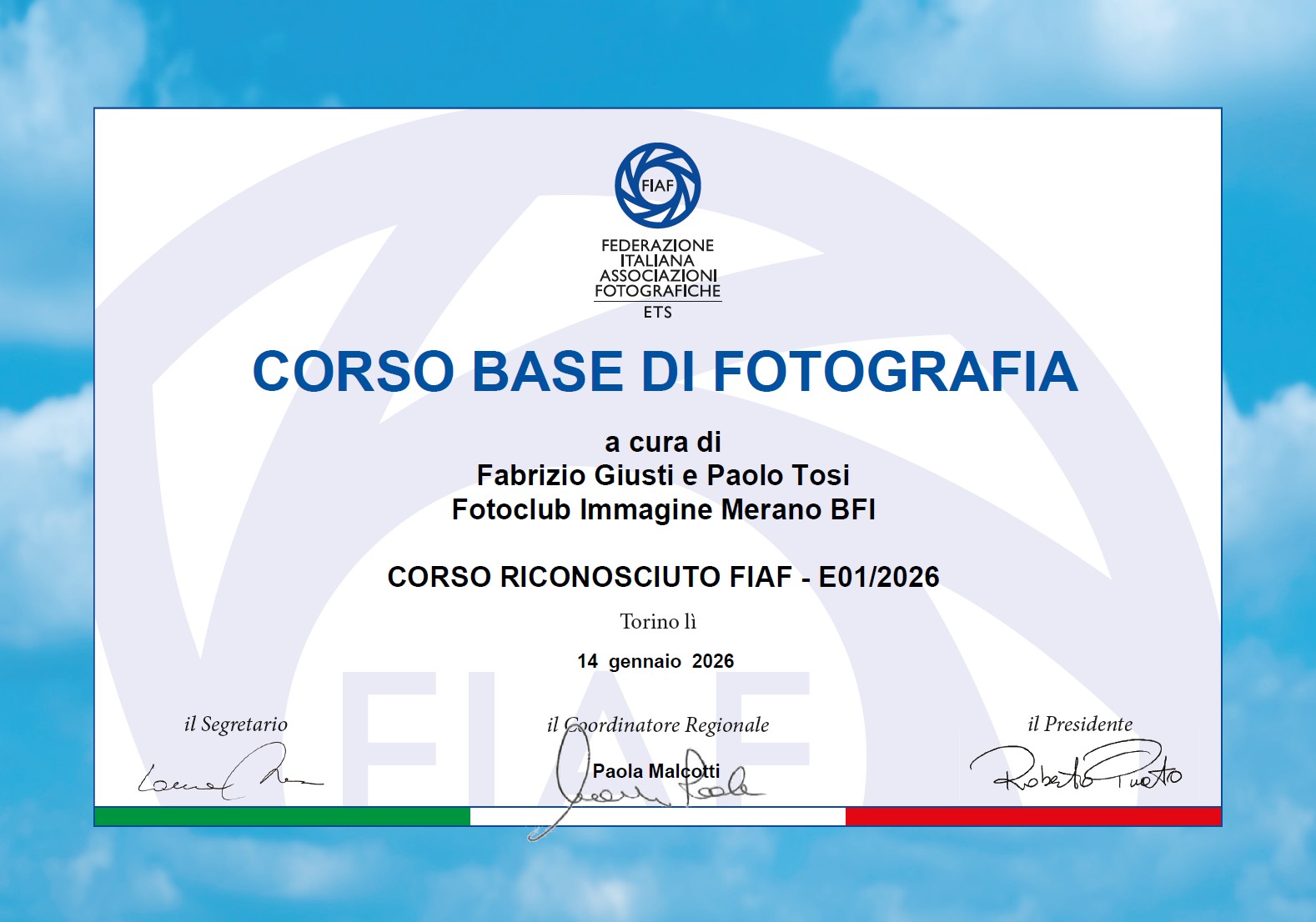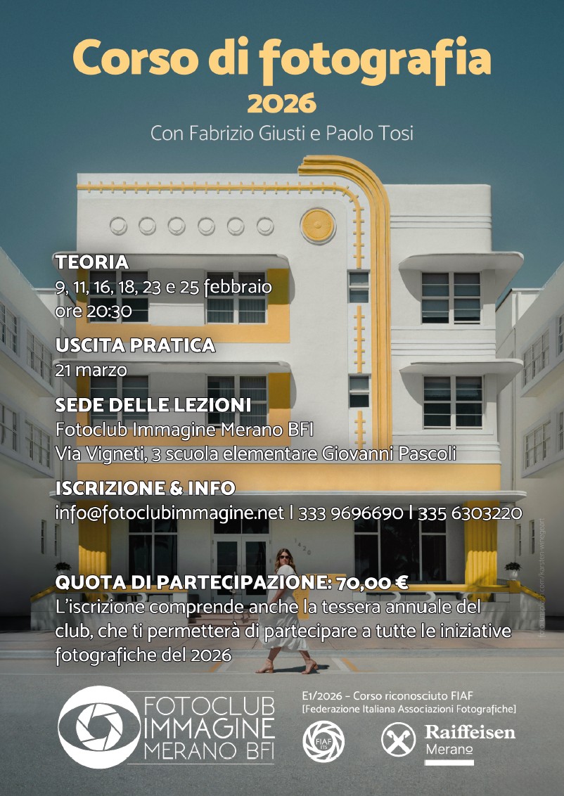 Il corso gode del riconoscimento E1/2026 dalla FIAF Federazione Italiana asscociazioni fotografiche.