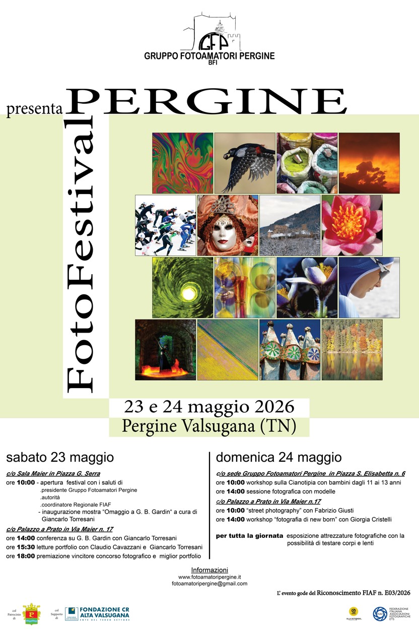 il Gruppo Fotoamatori di Pergine organizza – nelle giornate di sabato 23 e domenica 24 maggio 2026 – la prima edizione del “PERGINE FOTO FESTIVAL”, un intero fine settimana dedicato alla fotografia ed aperto a fotografi, fotoamatori, appassionati e cittadini.