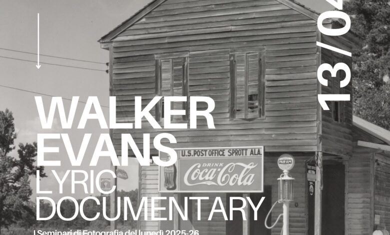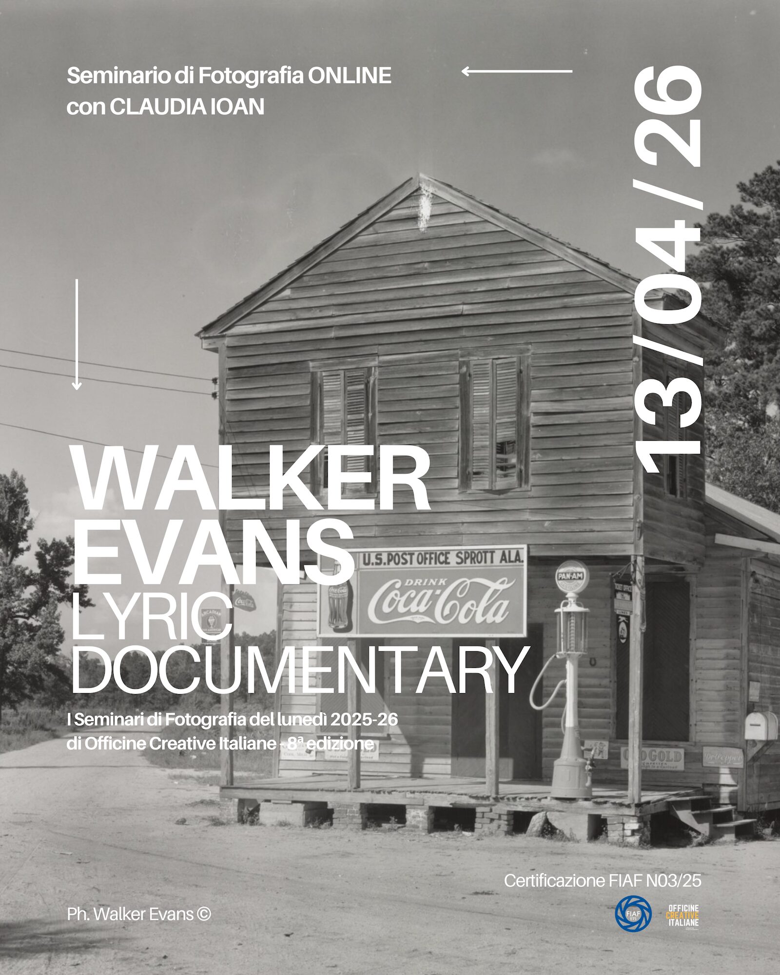 WALKER EVANS – LYRIC DOCUMENTARY fa parte della Stagione di Seminari di Fotografia online 2025-26 di Officine Creative Italiane, Associazione culturale fotografica. I Seminari di Fotografia sono una manifestazione annuale di formazione culturale permanente gratuita con cadenza settimanale, a cura di Claudia Ioan. Certificazione FIAF N03/25.